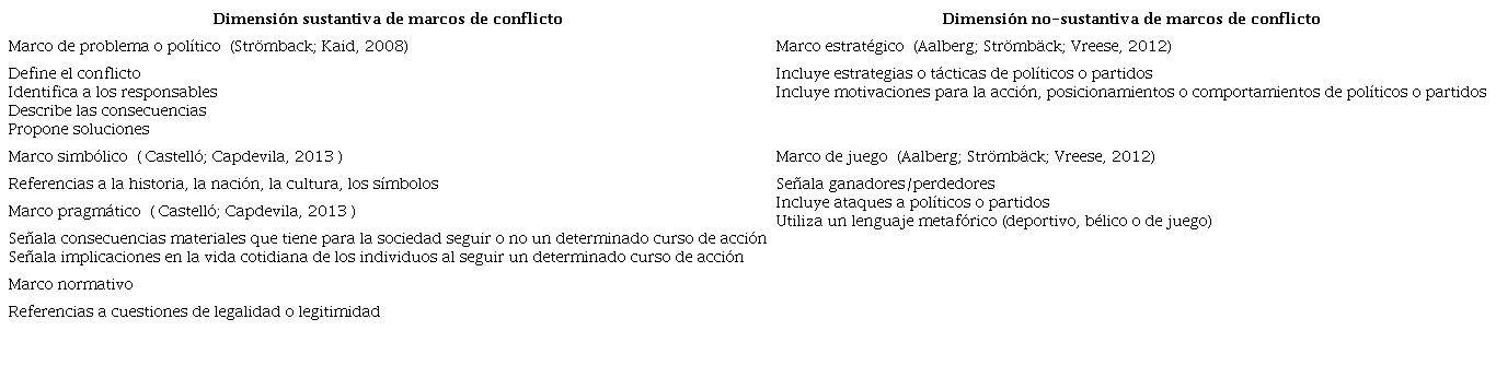Los marcos sustantivos de conflicto se aglutinan en cuatro categorías: (1) marcos del problema o políticos (Capella; Jamieson, 1997; Strömbäck; Kaid, 2008 ), que indagan en la forma en que se definen los temas políticos, sus causas, explican sus consecuencias y proponen soluciones; (2) marcos simbólicos , que recurren a la nación, la cultura o la historia para interpretar el conflicto; (3) marcos pragmáticos , que incorporan aspectos materiales - económicos o implicaciones concretas en la vida cotidiana de las personas - ( Castelló; Capdevila, 2013 ); y (4) marcos normativos , que se focalizan en argumentos de legalidad y legitimidad democrática para resaltar ideas, valores o principios democráticos. La incorporación de este último marco a nuestro análisis es de especial relevancia por tratarse de un conflicto que pretende la alteración del statu quo legal. Los marcos de conflicto no sustantivo se representan en dos categorías: marco estratégico y marco de juego (Aalberg; Strömbäck; Vreese, 2012). El marco estratégico interpreta los motivos de determinadas acciones y las posiciones de partidos o representantes políticos. El marco de juego representa la política como un juego y señala vencedores y vencidos.
