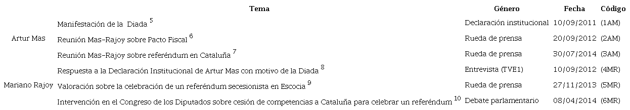 Para lograr los objetivos propuestos, se seleccionaron, en primer lugar, aquellos discursos de los presidentes Mariano Rajoy y Artur Mas que guardan relación con acontecimientos políticos relevantes ( Tabla 2 ):