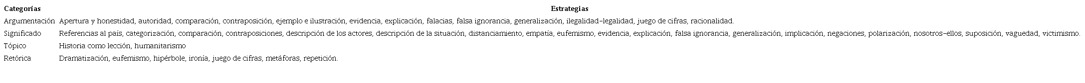 A fin de identificar los marcos de conflicto predominantes en los discursos seleccionados, se utilizó la tipología de marcos de conflicto (ver Tabla 1 ). Por otra parte, a partir de la propuesta de van Dijk (2008) sobre las estrategias de producción del discurso ideológico, se analizaron las estrategias que emplearon los líderes políticos ( Tabla 3 ):