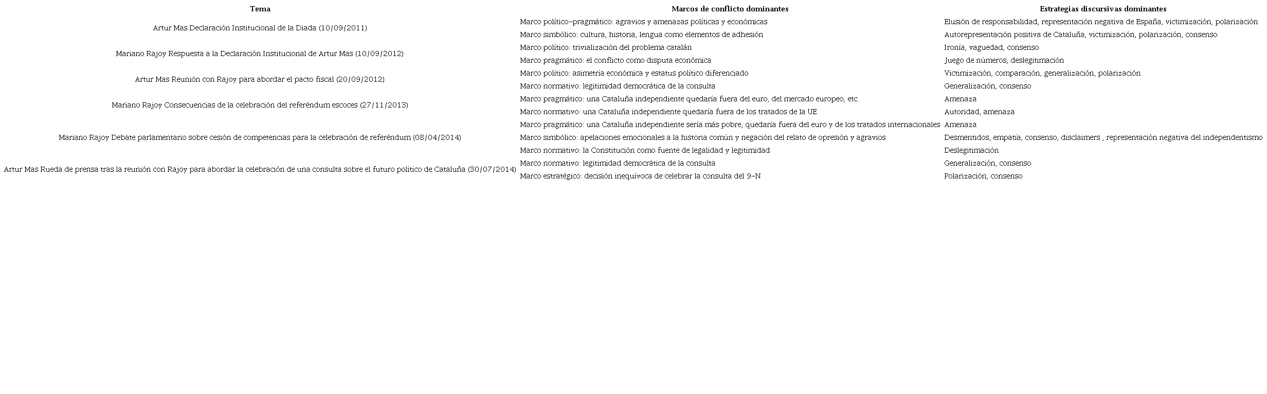 Como se aprecia en la Tabla 4 , tanto los marcos de conflicto como las estrategias discursivas que emplean Mas y Rajoy varían en función de las circunstancias políticas de cada momento. En el caso de Mas, es el marco político el que tiene mayor protagonismo en el arranque del procés por la necesidad de explicar las razones del conflicto y sus responsables, es decir, los agravios políticos y económicos del Estado español con Cataluña. Sin embargo, la Diada de 2012 marcará un punto de inflexión no solo por ser la más multitudinaria de las celebradas en Cataluña sino por el lema de la manifestación, " Catalunya, nou estat d'Europa" (" Cataluña, nuevo estado de Europa "), que anticipa un cambio en los marcos independentistas. Otro factor contextual que explica el cambio de marcos en los discursos de Mas es el resultado de las elecciones de noviembre de 2012 en las que CiU pierde doce escaños, lo que obliga a pactar la investidura de Mas con ERC. El inicio de la Transición Nacional caracteriza un nuevo tiempo político en el que los marcos normativo y simbólico adquirirán mayor relevancia. De hecho, la declaración aprobada por el Parlament en enero de 2013 considera a Cataluña como sujeto soberanía. Representan un hito más en esa transición. A pesar de la anulación de esta declaración por parte del TC y del posterior rechazo del Congreso de los Diputados a ceder competencias a la Generalitat para celebrar una consulta, el discurso de Mas de 2014 evidencia el camino de no retorno emprendido, de ahí que recurra al marco estratégico y al normativo para legitimar la decisión y mostrar la férrea determinación de llevarla a cabo.