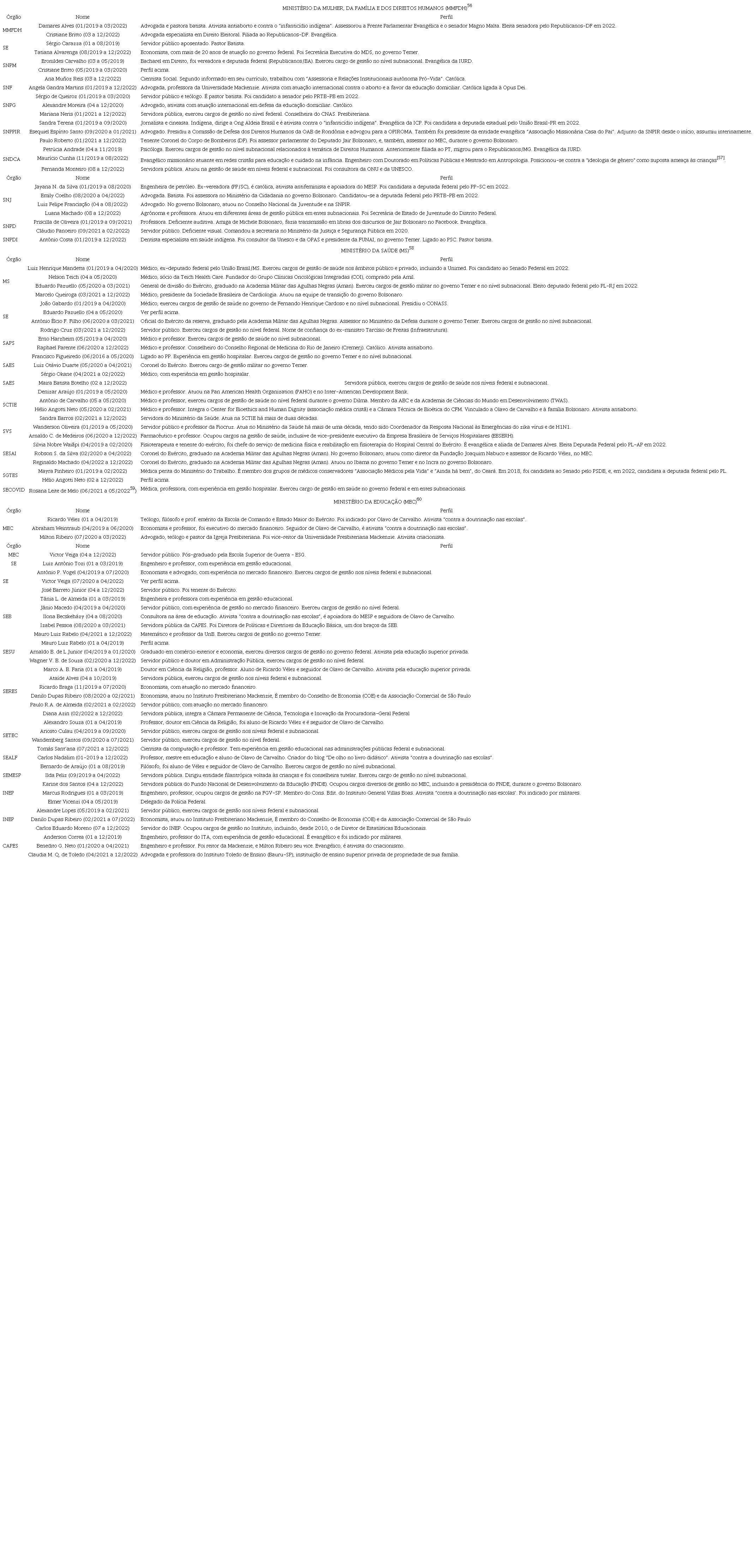 Os cargos principais do ministério são ocupados por mulheres que têm em comum o ativismo antiaborto, com atuação pública reconhecida, em uma perspectiva moral na qual a família, a infância e os “não nascidos” têm prioridade, em relação às mulheres, como sujeitos de direitos. Outra característica comum às ocupantes dos cargos mais relevantes da pasta é que têm formação e atuação jurídica. É o caso de ministras e secretárias de maior destaque, Damares Alves, Cristiane Britto e Ângela Gandra Martins, de que falaremos a seguir.