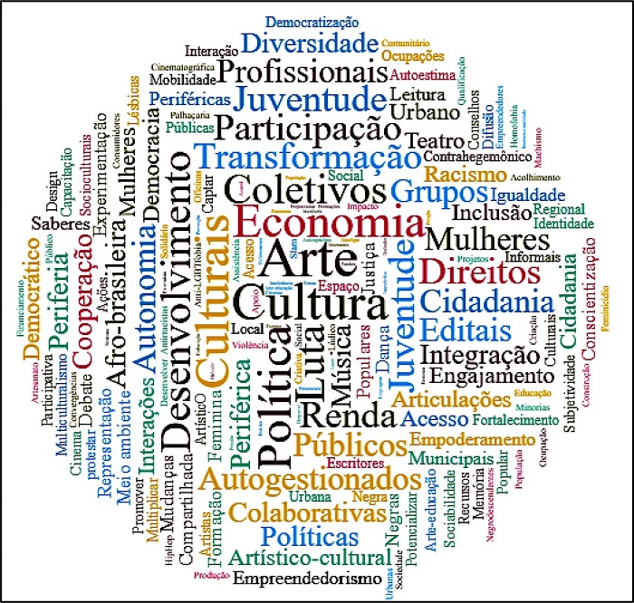 Nosso objetivo também consistiu em problematizar e compreender os sentidos presentes na construção da ideia de coletivo cultural, os quais nos ajudam na análise da criação e ressignificação de métodos, formas e práticas organizacionais e de ação dessas coletividades, bem como do contexto estratégico-relacional das diferentes emergências coletivas. Com isso, buscamos avançar sobre o que há de novidade nas experiências dos coletivos que permitam pensá-los como novas formas de organização, mobilização e ação da sociedade civil contemporânea.