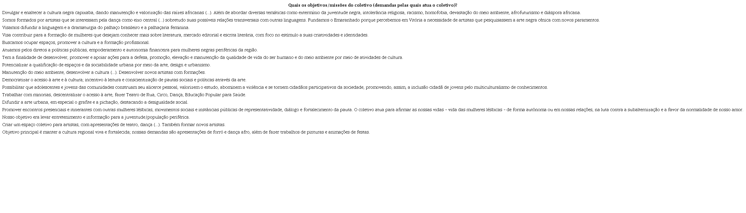 Especificamente com relação aos coletivos culturais no contexto capixaba, ao serem indagados sobre “Quais os objetivos/missões do coletivo (demandas pelas quais atua o coletivo)?”, percebemos uma diversidade de demandas de caráter político, social, cultural e profissional. A Figura 2, a seguir, busca sintetizá-la: