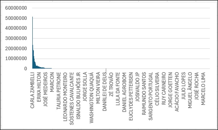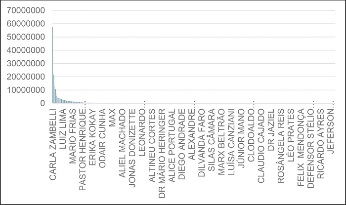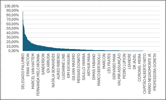 Como já foi dito, chamamos de “interações” a soma das métricas relativas ao número de reações, comentários e compartilhamentos. As interações foram coletadas de um único perfil do candidato eleito, seja no Facebook ou no Instagram. O perfil escolhido foi sempre aquele que apresentou maior número de seguidores, quando o deputado ou a campanha possuía mais de um perfil. O período de campanha considerado foi de 01 de julho a 02 de outubro de 2022, data do pleito. Pelo calendário oficial, a partir de 05 de julho foi permitido ao pré-candidato realizar propaganda intrapartidária com vistas à indicação de seu nome.