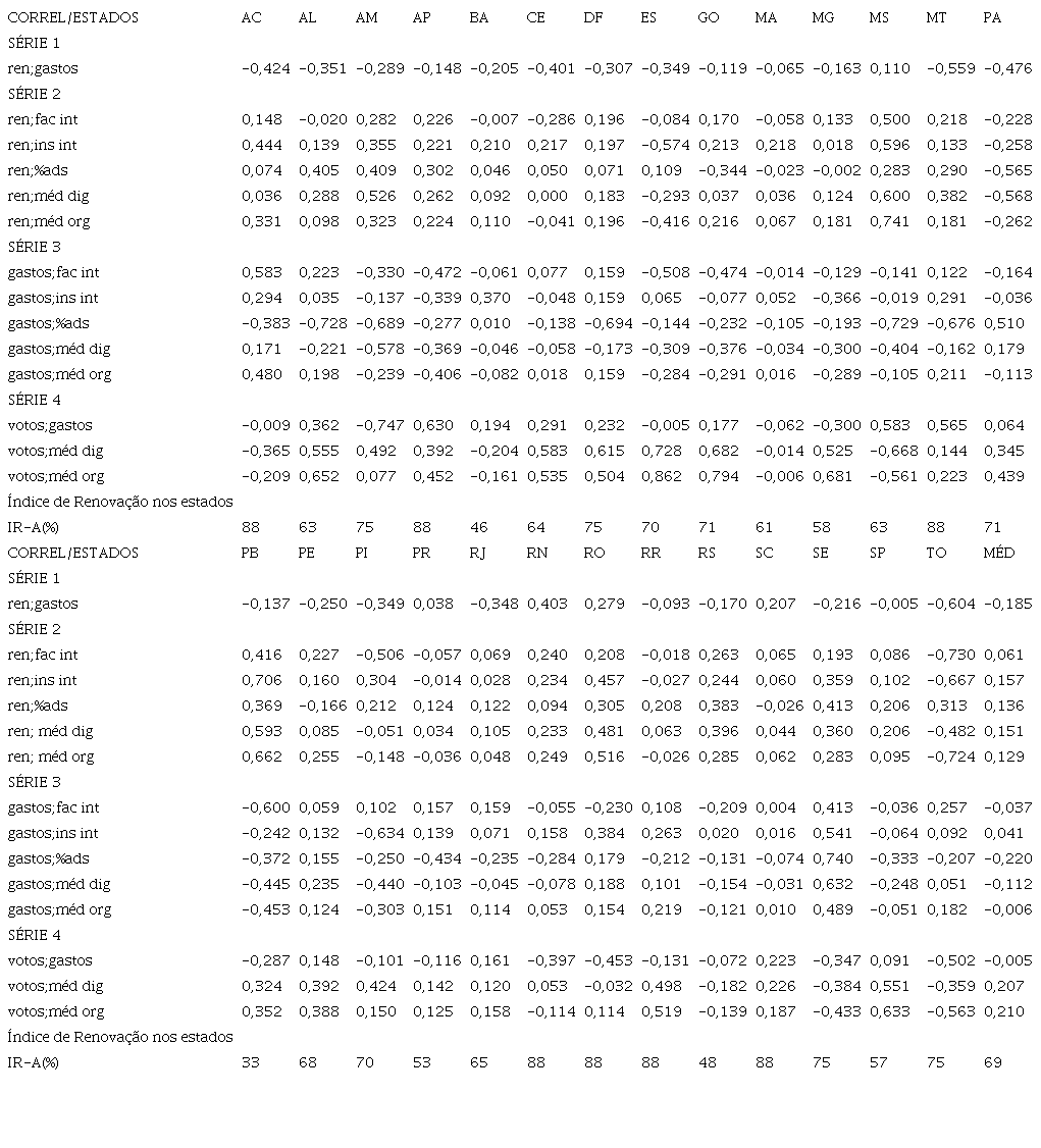 A Série 1 de correlações confirma majoritariamente a primeira hipótese da pesquisa aqui apresentada. Como vimos, esperamos, com H1, correlações negativas do grupo renovador com os gastos totais com a campanha, definindo esses novos políticos eleitos como de perfil com menos recursos à disposição para as contendas eleitorais. Foram encontradas correlações negativas fortes, moderadas e fracas em 19 contextos estaduais (70%). Duas correlações negativas fortes no MT (-.559, p < .001) e no TO (-.604, p < .001); oito moderadas no AC (-.424, p < .001), em AL (-.351, p < .001), no CE (-.401, p < .001), no DF (-.307, p < .001), no ES (-.349, p < .001), no PA (-.476, p < .001), no PI (-.349, p < .001) e no RJ (-.348, p < .001), bem como nove correlações fracas nos contextos de AM (-.289, p < .001), AP (-.148, p < .001), BA (-.205, p < .001), GO (-.119, p < .001), MG (-.163, p < .001), PB (-.137, p < .001), PE (-.250, p < .001), RS (-.170, p < .001) e SE (-.216, p < .001). A Média Geral das correlações foi de -.185 (p < .001). A confirmação da hipótese em 19 (70%) das 27 Unidades Federativas reforça o entendimento do grupo renovador como potencial demandante de equalização pelas mídias digitais, já que possuidor de menos recursos para a campanha.