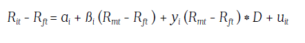 (7)Si el parámetro gamma ( yi ) resulta ser positivo y estadísticamente significativo a un cierto nivel de confianza preestablecido (95% con distribución de probabilidad t de Student en este caso), el fondo presentaría evidencia de ''market timing'' positivo, es decir, la exposición al mercado o al ''benchmark'' (pendiente total) aumenta al aumentar el exceso de rendimiento de este sobre la tasa libre de riesgo. Por otro lado, si gamma es estadísticamente insignificativo, se concluye que no hay evidencia de ''market timing'' (Bodie, 2014). Ahora bien si gamma es negativo y estadísticamente significativo, la conclusión podría ser que el administrador del fondo predice mal los movimientos del ''benchmark'' y la exposición en tendencias alcistas es menor que en tendencias bajistas, lo que sería ineficiente.