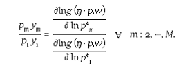 [6]Since x j does not appear in (5) and pm always appears along ŋ , one can solve for ŋ pm together with the price opportunity set g (ŋ • p, w) = 1 in terms of w and y. Hence, ŋ pm = p*m = Ø (w,ŷ) , ŷ = ym/y1. This expression relates optimal prices to output quantities and input prices.
