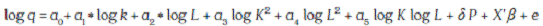 Because equation (2) is rather restrictive a more flexible specification is used, following a general form of a translog specification for the production function (Christensen, Jorgenson, and Lau, 1973). After including an error term, and additional controls for productivity, the specification to be estimated can be written as follows: