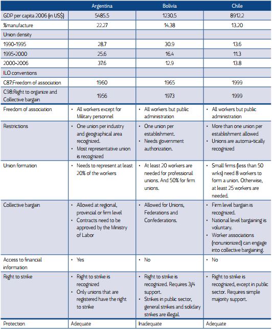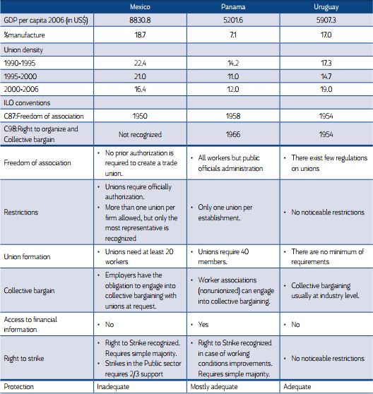There is a substantial literature focused on the development of unions in Latin America, most of which has taken a historical and legal approach describing the evolution of the labor movements in these countries. This section provides a brief overview of important features in the development of unions and legal framework in Argentina, Bolivia, Chile, Mexico, Panama and Uruguay.6