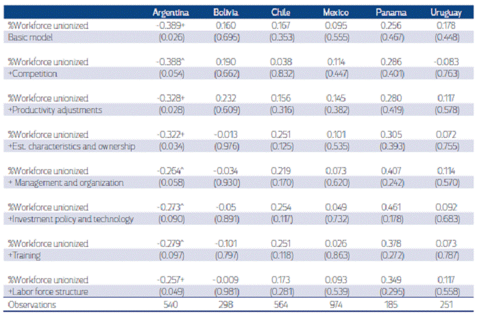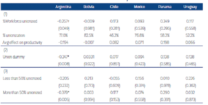 According to the results presented here, unions appear to have small but positive effects on productivity across all countries in the sample, with the notable exception of Argentina, where a strong negative productivity effect is found, and Bolivia, where no effect is found. The positive relationships between unions and productivity appear to be sufficient to offset higher labor costs, translating in small and insignificant profitability estimates. In addition, with few exceptions, unions seem to have either a null or negative effect for current investment decisions.