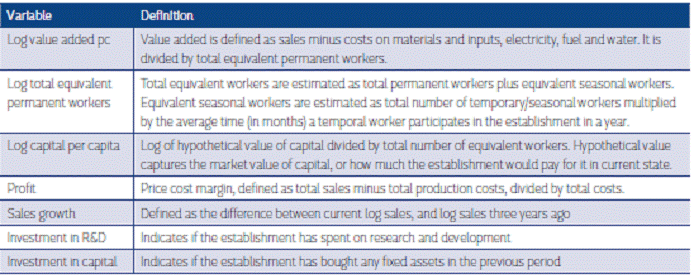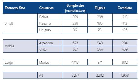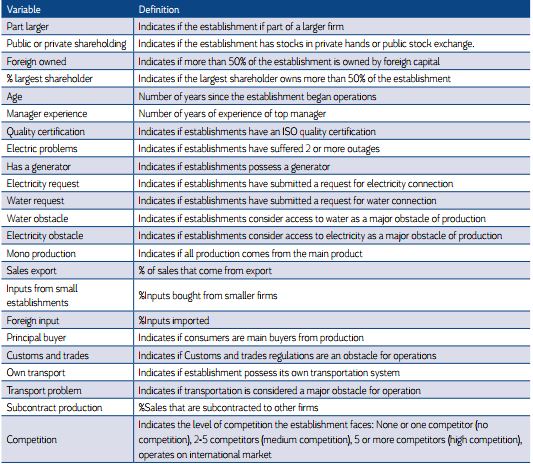 The present analysis uses data from the Enterprise Survey (ES) 2006, concentrating on the manufacturing sector in six selected Latin American countries (Table 2).8 The Enterprise Survey provides a standardized establishment level data set, with a representative sample of establishments in the non-agricultural, private sector.9 The survey provides rich information that can be used to identify aspects of establishment performance, market competition, managerial characteristics and labor force structure, among other things.
