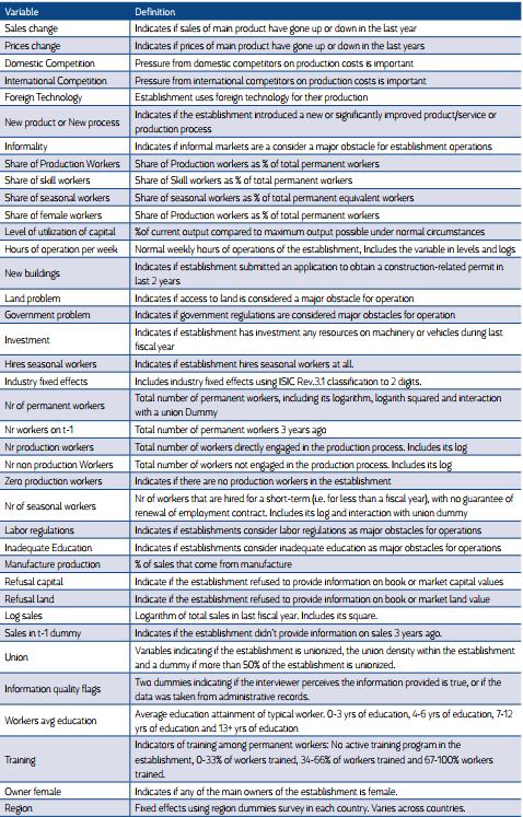 The working sample is restricted to establishments with complete information on labor, union status and sales variables. Establishments owned by the public sector (more than 50%) are excluded. To reduce the bias caused by new or large establishments, the sample is restricted to those with at least 3 years of operation and at most 500 permanent workers. Finally, in order to avoid biases due to data errors and inconsistencies, some minor edits are implemented.14 This reduces the working sample from 3,277 to 2,812 enterprises across the 6 countries.
