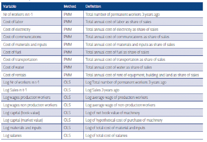 Following the specification shown in equation (3), the natural logarithm of value added per worker is used as the productivity measure. For observations where production costs exceed the value of total sales, total cost is constrained and the cases controlled using a dummy variable.22 For the production factors, employment is measured as the total number of permanent workers plus the equivalent number of seasonal workers, while capital is measured as log of the market value of machinery and equipment (including vehicles).23 In addition, the basic model includes controls for region and broad industry fixed effects. The main variable of interest, union density, is included as a share between 0 and 1, which indicates what share of the permanent labor force in the establishment is unionized.
