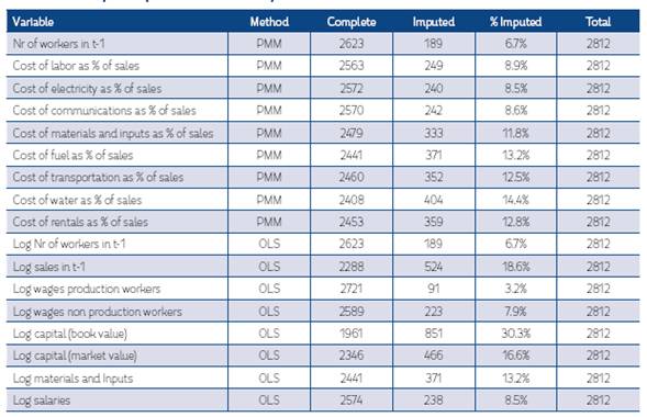 Table 3 presents a summary of the imputations for the most important variables in the study. As one can observe, information regarding capital, a fundamental variable in the analysis, has one of the largest incidences ofmissing information (30.3% book value ofcapital and 16.6% marketvalue). Among production costs, the costs of electricity and communication have the lowest missing rates (8.5% and 8.6%), while costs of fuel and water have the highest rates of missing information (13.2% and 14.4%).