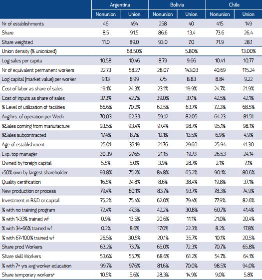 Except for Argentina, unionized establishments have higher levels of sales per capita than their counterparts, and, with the exception of Argentina and Mexico, unionized establishments have higher levels of capital intensity.19
