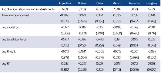 Unions can also influence the structure and composition of the workforce within establishment, changing the mix of production factors and affecting productivity. The last estimates in Table 6 control for two aspects of workforce characteristics: workers’ average education and workforce structure. Except for Chile and Panama, controlling for these effects increases the impact of unions on productivity. In Bolivia, Mexico and Uruguay, similar to the evidence at the micro level (Rios-Avila and Hirsch, forthcoming), unionized establishments are associated with low-educated, low-skill workers, and not controlling for it understates productivity. The evidence, however, is insufficient to detect the effect of other workforce characteristics on union-productivity effect.