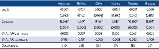 Given the type of production function used here, the coefficients for capital and labor are more difficult to interpret than in the standard Brown and Medoff model. To facilitate interpretation, at the bottom of Table 5, the derivatives with respect to labor and capital are obtained and evaluated at the mean.25 The parameters are consistent with the expectations for Bolivia, Chile and Mexico. In Argentina, Panama and Uruguay, however, the estimates are somewhat unexpected as the marginal effect of capital is almost zero, with a positive marginal effect from labor. Although these results are worrisome, they remain consistent across different specification, and should not to be crucial for the main focus of the analysis.
