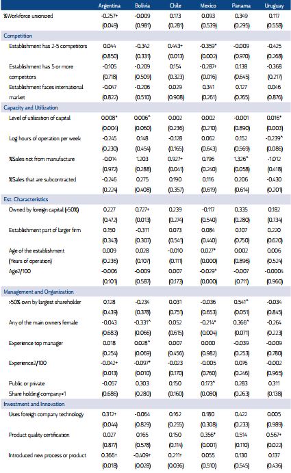 Uruguay has transitioned toward a decentralized bargaining system that tries to incorporate productivity clauses in their contracts (O’Connell 1999; Cassoni, et al. 2005), similar to the Chilean model. In Mexico, the combination of a centralized bargaining system, and conflicts between employers and unions, reflected in the violation of union rights, should have generated a negative productivity impact, which is not observed. In the case of Bolivia, the results show that unions have no net effect on productivity, and positive relationships are mainly driven by establishment characteristics, in particular the type of ownership. Then again, the presence and strength of unions might be too limited (compared to the other countries) to generate substantive pressure for productivity enhancements.