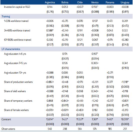 Because unions are often associated with lower turnover, unionized establishments might be more likely to provide more training, since they can benefit from the returns of such investment through higher productivity (Kuhn 1985; Allen 1984). Although human capital upgrades are legitimate sources of productivity enhancements, they may not necessary generate improvements in technical efficiency. Including training as a control variable in the estimations see Table 7) shows that, on average, training has a positive, mostly not significant, impact on productivity. Adding these controls to the specification has the expected negative effect on the union-productivity relationship for all countries, especially for Panama, indicating that training is an important channel through which unions improve productivity.