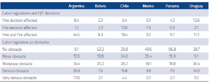 As Kuhn (1998) and others have argued, negative productivity effects have been typically found in environments of union and management conflict, which might explain the results observed in Argentina. In Table 8, two aspects of labor regulations and the perception of management are presented. About 44% of establishments in Argentina consider that labor regulations are serious or very serious obstacles to the operation of the establishment. Similarly, 60% of establishments declare that labor regulations have affected their hiring and firing decisions, which is almost twice as high as in other countries.26