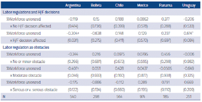 To assess the extent that perceptions of labor regulations affect the union-productivity relationship, Table 9 presents two alternative specifications that show the interaction between unionization rates and the perception of regulations. The direction of the estimates suggests unions have a smaller (or larger and negative) effect on productivity in cases of negative perception of labor regulation. For instance, except for Mexico or Uruguay, the union-productivity effect is smaller (or more negative) if establishments perceive that laborregulations have affected theirdecisions on hiring or firing workers.