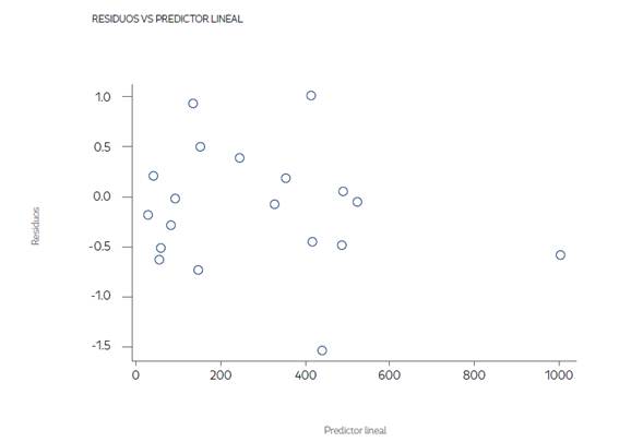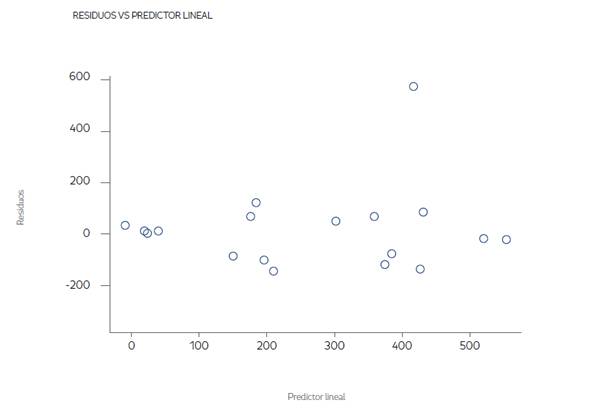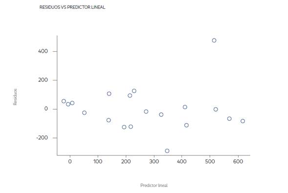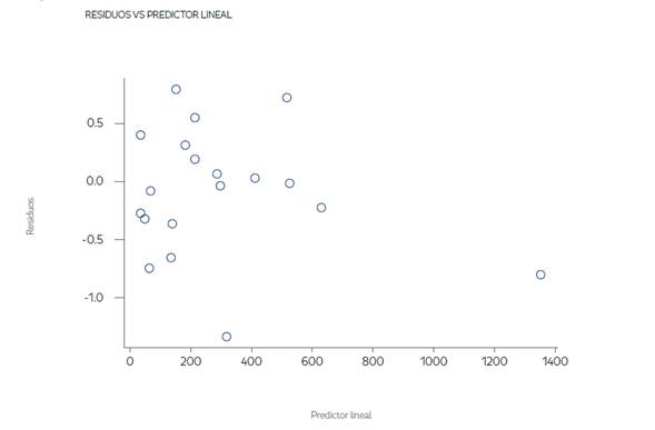 Este comportamiento del grado es contrario a lo esperado, lo que parece indicar que tener un gran número de conexiones puede también llevar a saturar el sistema, lo que se refleja en un incremento en la tasa de hurtos. Los criterios de informacion permiten concluir que para todos los casos, el modelo con la Red B tiene un mejor ajuste que el de la Red A. Al observar el ajuste de los errores en el modelo Normal (Figuras 7 y 9) y Gamma (Figuras 8 y 10) existe un buen ajuste de los errores frente al predictor lineal, aunque en todos los casos se presentan problemas para ajustar algunos puntos que corresponden a los casos en donde las tasas de hurtos son muy altas. Con esta informacion se concluye que existe un mejor ajuste del modelo Gamma con la Red B, frente a los otros modelos considerados.