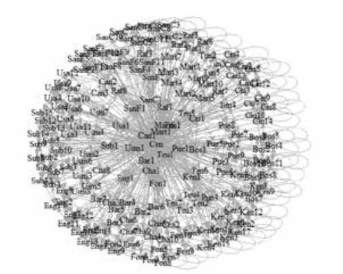Se dice que el grafo es dirigido cuando la comunicación tiene un solo sentido y no dirigidas si la relación se presenta en ambos sentidos. Estas relaciones pueden ser representadas en forma ma-tricial mediante la matriz de adyacencia A, que para este caso particular es cuadrada, binaria y por tanto no dirigida8, donde 1 indica la existencia de una arista entre nodos adyacentes i,j y 0 en otros casos. Los grafos poseen un sin número de medidas que permiten su caracterizacion. En este caso particular se concentra en las medidas de centralidad del grado y la intermediación. Así, el grado indica el número de conexiones adyacentes de cada nodo (Freeman 1979) que, en el caso de una red no dirigida, se calculan como: