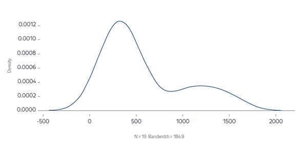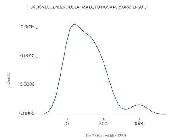 En las Tablas 3 y 4 y en las Figuras 5 y 6 se presentan los datos, la estadística descriptiva y la densidad empírica para ambas variables. Se observa que la mayoría de los hurtos a personas ocurren en las localidades de Fontibon, Engativá y Barrios Unidos, mientras que en Candelaria, Puente Aranda y Ciudad Bolívar es donde menos se registran. En lo que respecta a la tasa de hurtos por cada cien mil habitantes, las localidades con mayores valores son Martires, Antonio Nariño y Barrios Unidos, mientras que las de menores valores son Ciudad Bolívar, Kennedy y Suba.