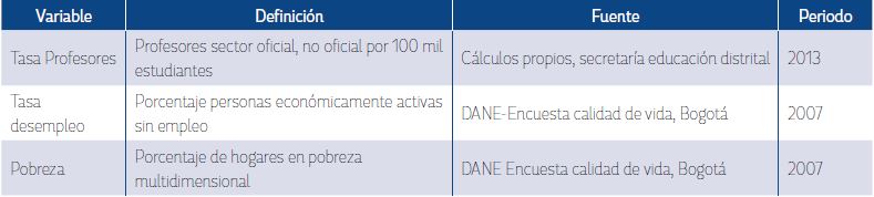 Adicionalmente, como variables explicativas se recurre al grado y la intermediación de la red que reflejan el nivel de comunicación entre los cuadrantes, mientras que como variables de control se utilizan la tasa de profesores por cada cien mil estudiantes, que sirve como proxy de la infraestructura en educación brindada por el gobierno, la tasa de desempleo que se utiliza como medida del mercado laboral y refleja la situación de empleo en las localidades y la pobreza multidimensional de los hogares como medida del grado de desarrollo en cada localidad. Todas estas variables se miden a nivel de cuadrante y su descripción específica se encuentra en los anexos de este trabajo.