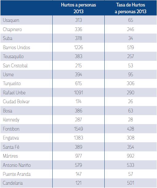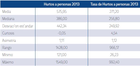 En este caso específico, se desea conocer el efecto de la comunicación entre los CAI en la criminalidad por localidades, se utiliza como variable a explicar los datos de hurtos a personas en 2013 por localidad9. La elección de esta variable radica en que este es uno de los crímenes más comúnes en Bogota, y es una de las variables estándar para la medición de violencia y criminalidad10.