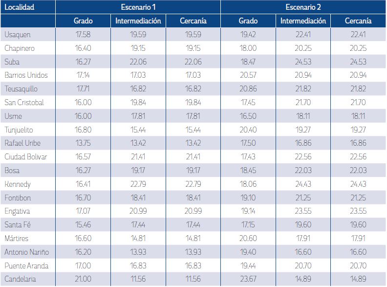 Una vez construidas las matrices de adyacencia se procede a calcular el grado, la intermediación de cada uno de los individuos en la red. Teniendo en cuenta que el resto de la información se encuentra a nivel de localidad (véase Tabla 2) se calcula el grado y la intermediación promedio de la localidad (Tabla 5). Aunque es posible considerar otro tipo de medidas como la mediana o la moda, puesto que no se observan grandes asimetrías ni valores muy atípicos en estas medidas.