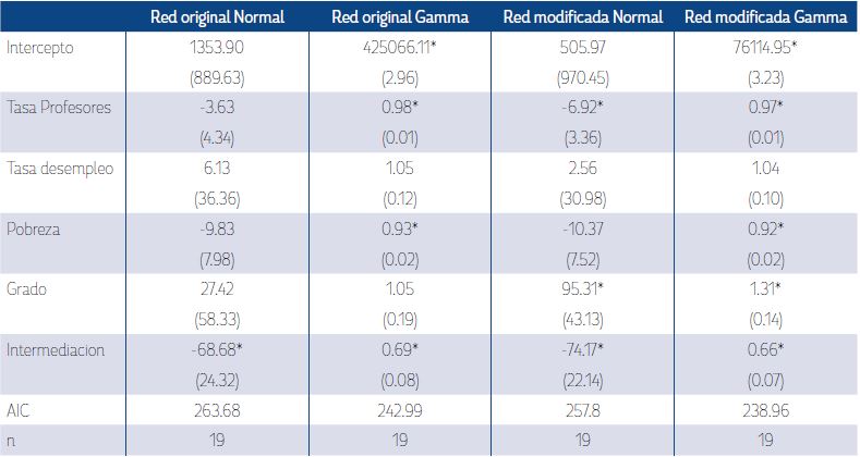 Cuando se consideran los modelos con la red B, en el caso del modelamiento normal, la tasa de profesores y la intermediación son significativas y negativas y el grado es significativo y positivo. Este mismo comportamiento se observa en el modelo Gamma, donde la tasa de profesores, la pobreza y la intermediación disminuyen la probabilidad de observar tasas de hurtos más altas, mientras que el grado la incrementa.