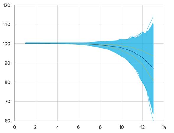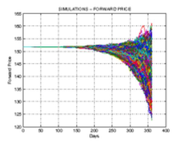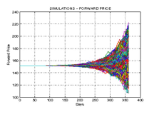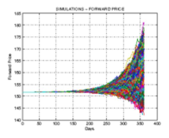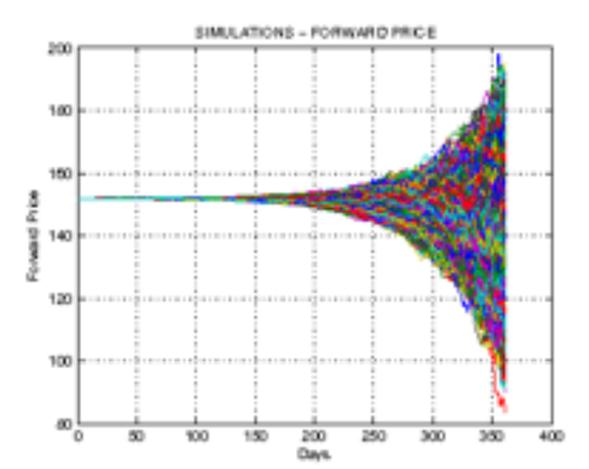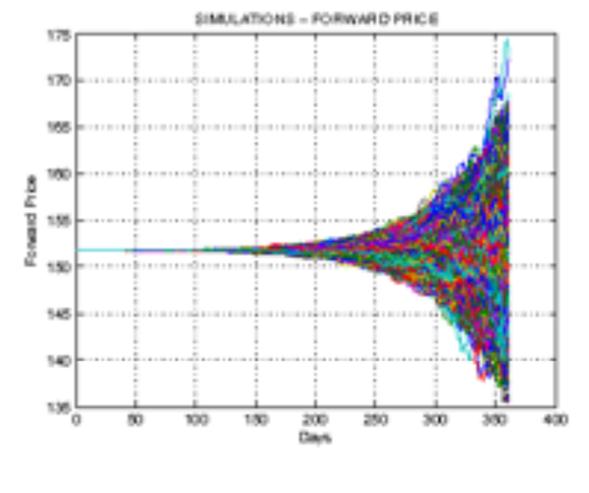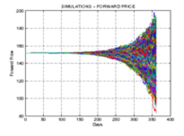 (10)Cuya expresión no tiene la misma forma que la ecuación diferencial propuesta para el precio spot. En la componente estocástica, se aprecia cómo la volatilidad instantánea del precio spot es constante σ, mientras que para el precio del contrato forward cambia con el tiempo σ·e -k (T-t) . En la Gráfica 1 se presenta una simulación de diez mil trazas construidas con la ecuación (10), para un vencimiento de 12 meses, un valor de σ de 15 y los parámetros correspondientes para el mercado colombiano que aparecen en el anexo de este trabajo.