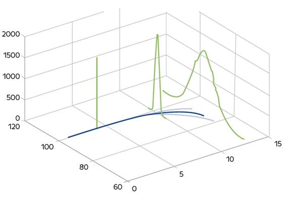 En la Gráfica 2 se muestra la misma simulación, solo que esta vez se presenta en el eje z, la frecuencia de los histogramas del precio. Como lo explican Trespalacios, Rendón, & Pantoja (2012), la volatilidad del precio forward será menor que la volatilidad del spot.