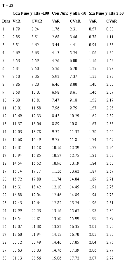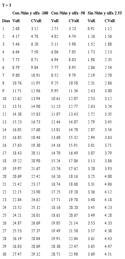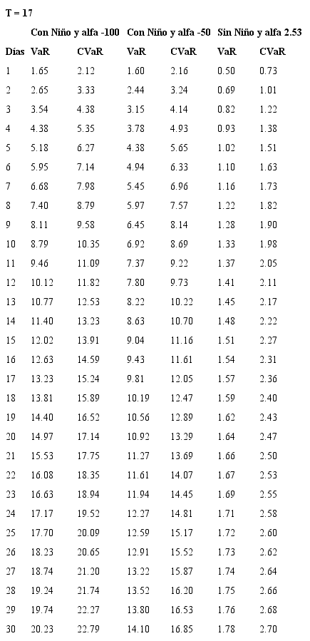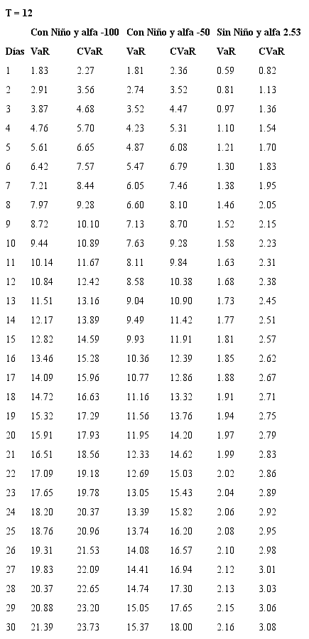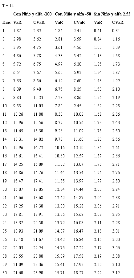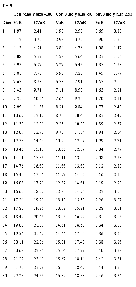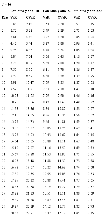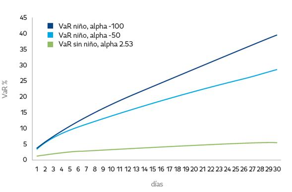 Se encuentra, adicionalmente, que el aporte marginal al VaR por el aumento del número de días depende de la prima de riesgo de largo plazo considerada, es así como deben considerarse casos extremos para primas de riesgo y no conformarse con un análisis de prima de riesgo promedio histórico. Para los valores con los que se construyen estas sensibilidades se consultó con especialistas del sector eléctrico acerca de posibles valores de alfa para casos extremos (durante un evento El Niño).