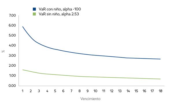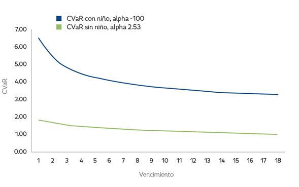 Por otro lado, es consistente la relación inversa del CVaR y el vencimiento del contrato de futuros, contratos con vencimientos menores reportan un CVaR superior. Asi, a un contrato de futuros con vencimiento en 1 mes le correspondería un CVaR de dos días de aproximadamente 6,5%, mientras que para un contrato de futuro con vencimiento en 18 meses esta misma medida de riesgo estaría alrededor del 3.3%.
