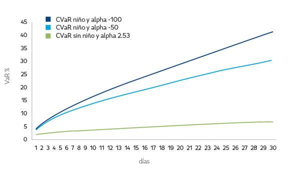 Se estima el CVaR como una medida alternativa al VaR que cuantifica la magnitud esperada de las pérdidas en que se podría incurrir en caso de superarse el VaR. El CVaR se mide como la esperanza matemática de las pérdidas superiores al VaR, para un nivel de confianza del 99%.