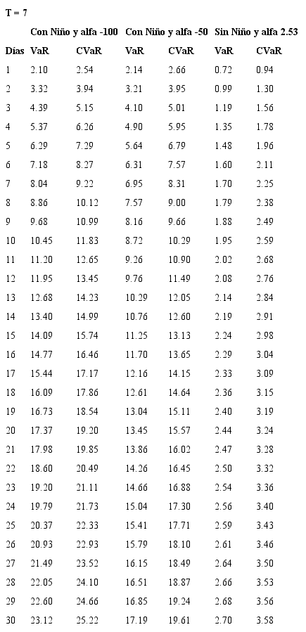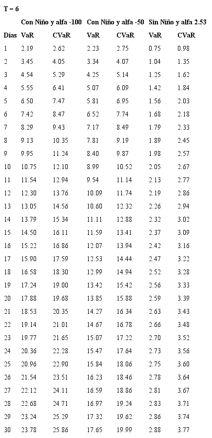 En la tabla 6, se presenta una propuesta de los niveles de garantías a exigir en el mercado colombiano de futuros sobre energía eléctrica, logrando una cobertura de 5 o más días en eventos extremos de Fenómeno del Niño.