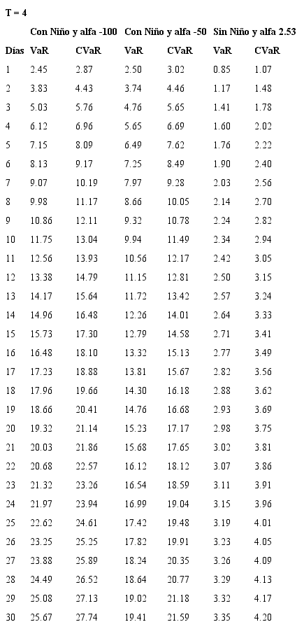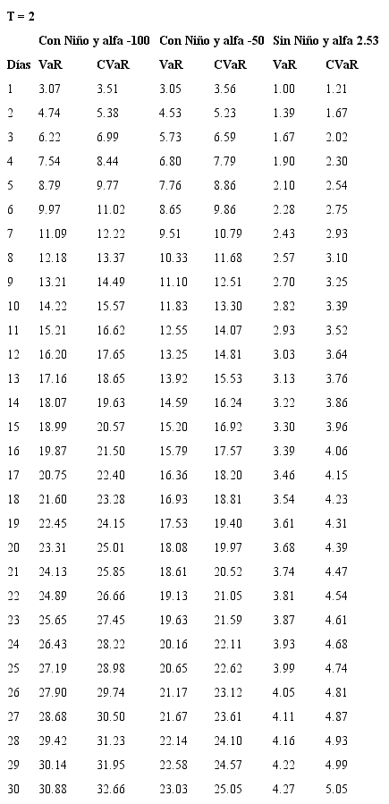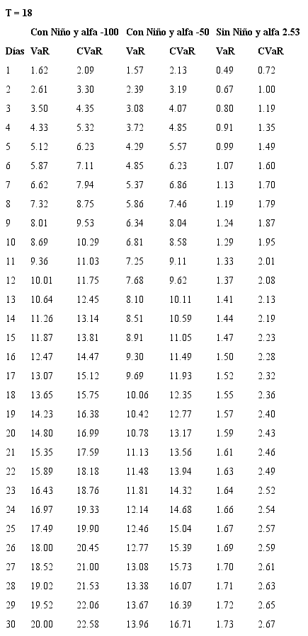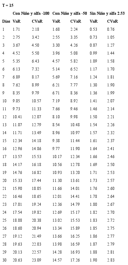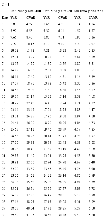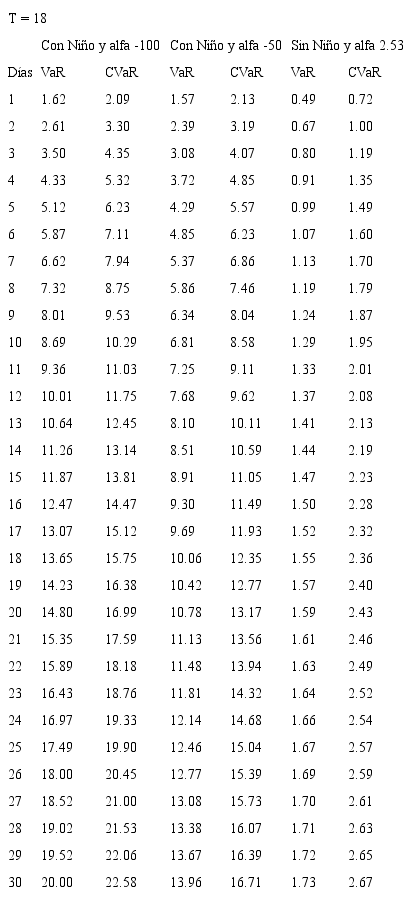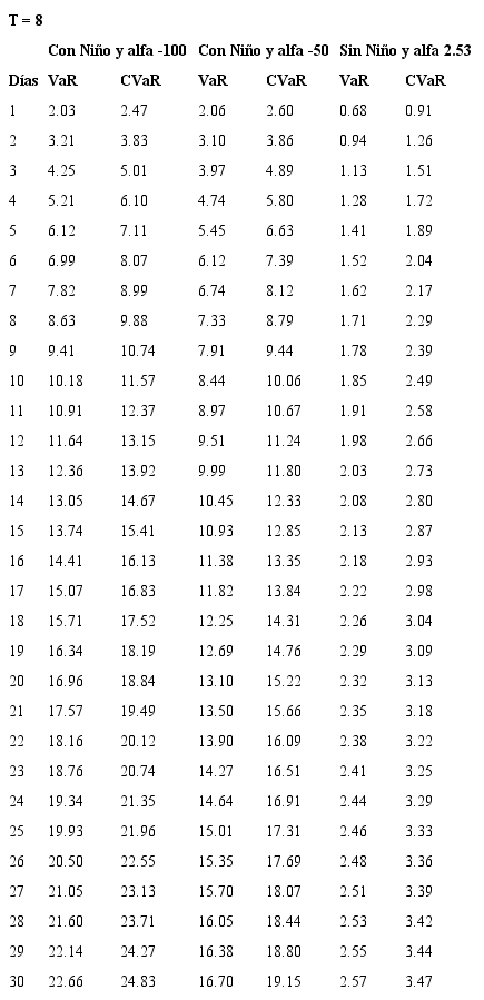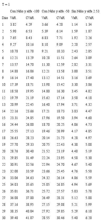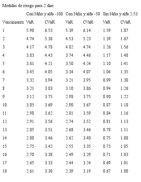 Bajo el entendimiento de los riesgos que asume la Cámara de Riesgo en un mercado sin liquidez y con el fin de estimar las garantías exigidas a quienes participan en este mercado, se plantea el uso de modelos de riesgo de mercado con un nivel de confianza del 99%, para un horizonte de d días y sobre el precio del futuro en el evento de presentarse Fenómeno del Niño. Así, se estima el VaR y el CVaR para los contratos de futuros con vencimiento mensual de 1 a 18 meses y para posiciones que van desde 1 hasta 30 días, con un nivel de confianza del 99%. Como se mencionó anteriormente, los eventos extremos en mercados de energía eléctrica corresponden a periodos donde se presenta el Fenómeno del Niño, por esta razón, en las estimaciones del riesgo se tienen en cuenta diferentes valores de prima de riesgo correspondientes a periodos de Niño y periodos de no Niño, se propone que la cámara obtenga protección ante el 99% de los eventos Niño, lo cual es coherente con el riesgo que asume ante un mercado ilíquido como lo es Derivex.