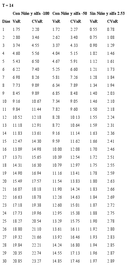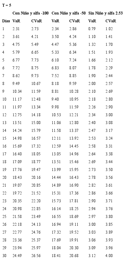 Evaluación de riesgo en función de días de tenencia y periodos de vencimiento A continuación, medición del riesgo en función del vencimiento T de un contrato y los días de tenencia d, para diferentes escenarios según eventos de Niño y primas de riesgo.