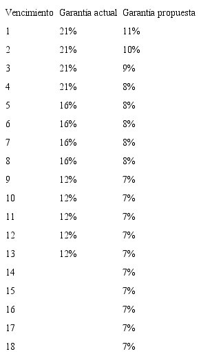 Los resultados de aplicar la metodología propuesta en este documento, partiendo de un escenario de aversión al riesgo, sugieren unos valores diferentes a los que actualmente exige la Cámara de Riesgo en términos de garantías. Con los parámetros utilizados para el mercado colombiano la propuesta de garantías se resume en dos tablas: una, que presenta las garantías estimadas para diferentes vencimientos y otra, que presenta las garantías estimadas dependiendo del número de días de cobertura, d. Conforme se conozca más información sobre la evolución de los precios y las transacciones que se den en Derivex, será necesario estimar de nuevo las garantías partiendo de la serie histórica de precios de futuros.