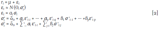 Bollerslev (1986) propuso una nueva formulación de los modelos de heterocedasticidad condicional autorregresiva (ARCH) desarrollados por Engle (1982), con el fin de evitar las restricciones2 y la pérdida de precisión en la estimación de series financieras con un número elevado de retardos, los cuales, generalmente, están correlacionados. La reparametrización denominada heterocedasticidad condicional autorregresiva generalizada (GARCH por sus siglas en inglés Generalized Autoregressive Conditional Heteroskedasticity) depende de un número reducido de parámetros, además del cuadrado de los errores retardados (como en el modelo ARCH) de la varianza condicional retardada.