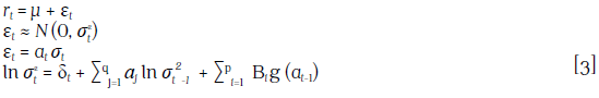 Debido a que los modelos ARCH/GARCH establecen restricciones difíciles de lograr, como la no negatividad de los parámetros, además de la inadecuada estimación del efecto apalancamiento, Nelson (1991) determinó una nueva parametrización que contempla, de manera diferenciada, los efectos de noticias positivas y negativas en los rendimientos; es decir, que la respuesta de la volatilidad no suele ser simétrica en la práctica, como lo plantean los modelos ARCH/GARCH, sino que, por el contrario, resulta ser de mayor magnitud ante disminuciones en los precios que ante subidas en estos. Los modelos GARCH exponenciales, o EGARCH, consideran los efectos asimétricos de la volatilidad de los rendimientos y no presentan restricción de no negatividad de los parámetros. La especificación del modelo, de forma general, se puede expresar así: