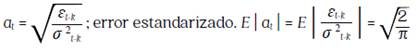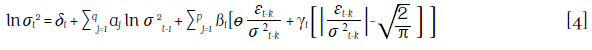 Para representar el efecto magnitud, en el término γ [ | at | - E | at |] se asume que ɵ = 0 y que γ = 0. La innovación en ln σ 2 es, entonces: positiva, cuando la magnitud de a es mayor que su valor esperado; y negativa, cuando la magnitud de at es menor que su valor esperado. Si se asume que ɵ < 0 y que γ = 0, se tiene que la innovación en la varianza condicional es: positiva, cuando la innovación en los retornos es negativa; y negativa, cuando la innovación en los retornos es positiva (Fernández 2009).