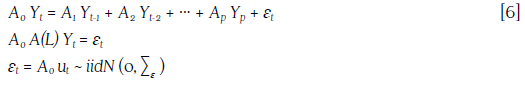 donde Yt son vectores k x 1 de variables endógenas del sistema, Yt-1 son los vectores de las mismas variables endógenas de forma rezagada en i, A1 con las matrices k x k de coeficientes y ɛt es un vector k x 1 homoscedástico y no autocorrelacionado.
