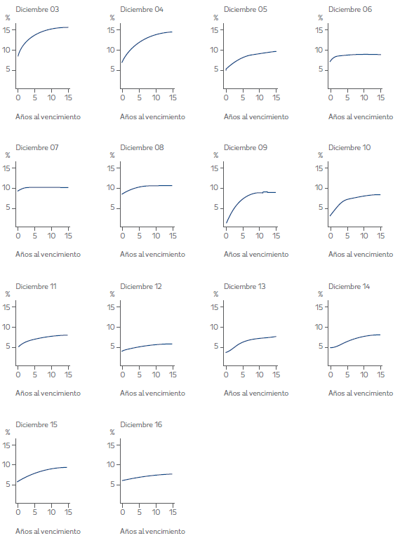 En la Figura 1 se ilustra una variedad de formas de la estructura temporal de tasas de interés del mercado colombiano de deuda pública, usando la metodología de Nelson y Siegel (1987), en el último día hábil del mes de diciembre para cada uno de los años que forman parte de la muestra.