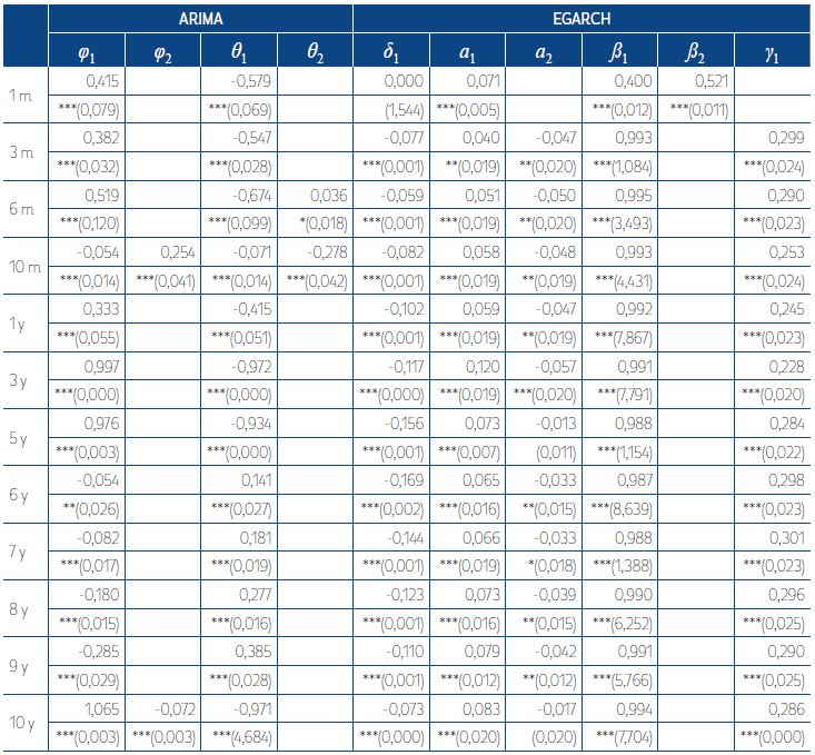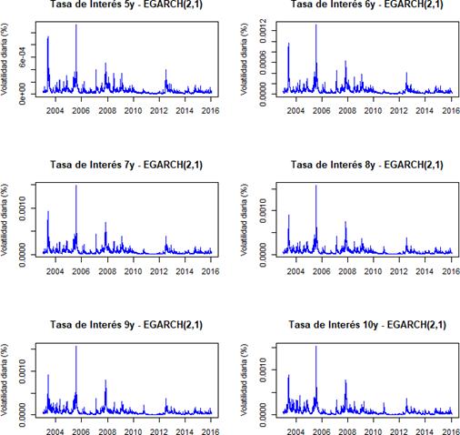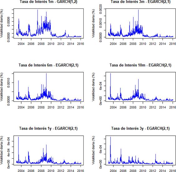 Para la estimación de la volatilidad de la ETTI de los diferentes períodos de madurez, se eligieron los modelos EGARCH (especificado según la ecuación 4) en 11 de los 12 casos, dado que los resultados de los diferentes test de simetría sugirieron la presencia de asimetría y teniendo en cuenta que estos son modelos dinámicos más flexibles para la estimación de la ecuación de varianza en comparación con una especificación asimétrica alternativa de un modelo de tipo Threshold ARCH, TARCH (Díaz et al., 2009).