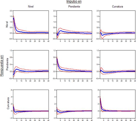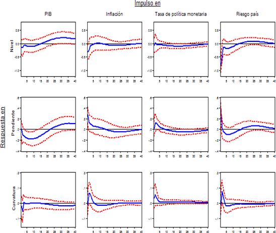Para estimar las funciones impulso-respuesta, se utilizó el modelo SVAR, según la ecuación 6, y se aplicaron las restricciones contemporáneas, especificadas en la sección tres, a las relaciones entre las variables del sistema compuesto por las variables macroeconómicas y los componentes principales de la volatilidad de la ETTI.