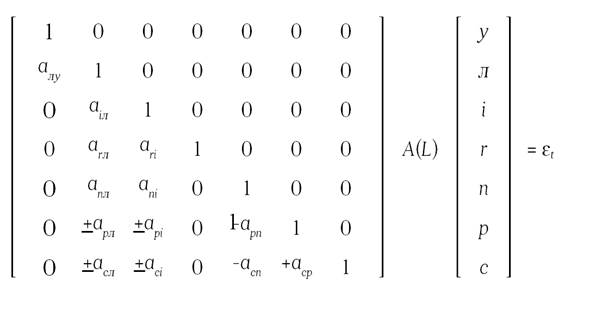 donde Ф = A -1 A , para i=1, ... , p y e = A -1 ɛ . y es nx1 y existen pn 2 elementos en (Ф Ф ... , Ф ) y n (n + 1) / 2 elementos en la matriz de covarianzas de las perturbaciones, la cual viene dada por ∑ e = A -1 ∑ (A -1). Además, ɛ ~ iidN (0, ∑ ).