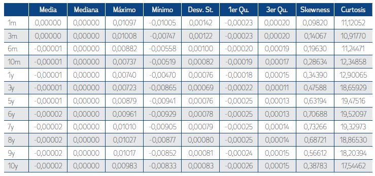 En la Tabla 1 se encuentra ilustrado el resumen estadístico para cada uno de los rendimientos en primeras diferencias, dado que, según las pruebas de raíz unitaria, las series no presentan un comportamiento estacionario. Los resultados muestran que las tasas de interés, en todos los casos, tienen como característica principal la presencia de colas pesadas, dado que la curtosis es bastante alta y superior a tres, lo que sugiere la existencia de datos atípicos y ausencia de normalidad. Asimismo, según del estadístico skewness, las series no presentan un comportamiento simétrico, puesto que los resultados son lejanos de cero, mostrando que las tasas de interés no presentan una distribución normal y, por el contrario, muestran un sesgo a la derecha.